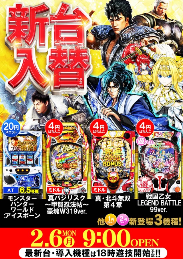 ☆本日☆新台入替(予定)☆9時スタート☆最新台は18時開放!