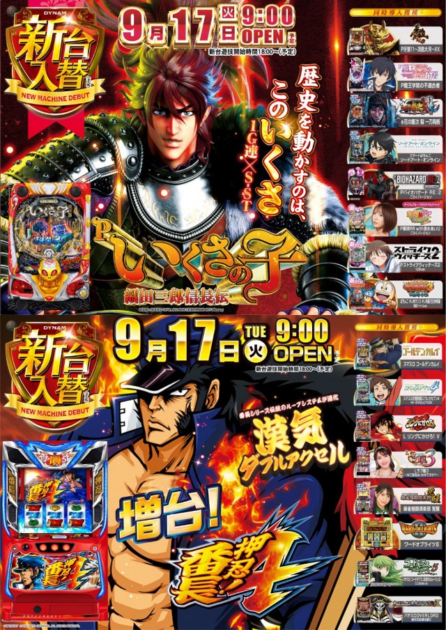 9/17(火)新台入替~Pいくさの子、番長4増台等導入予定