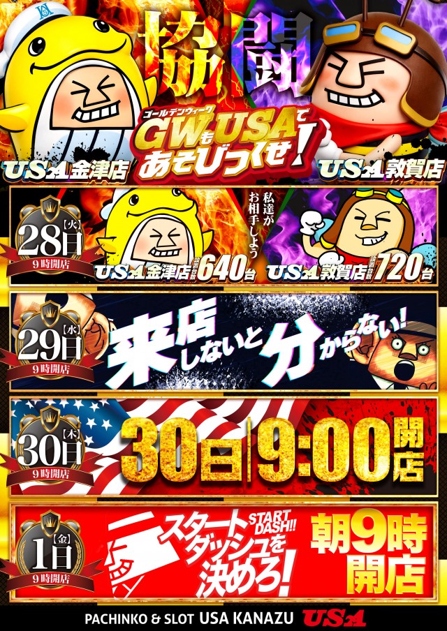 4月28日【火曜日】GWもUSA金津店!朝9時開店!