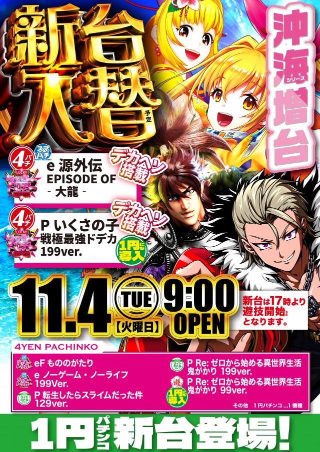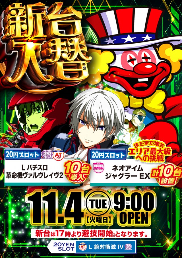 11月4日【火曜日】USA金津店新台入替9時開店!