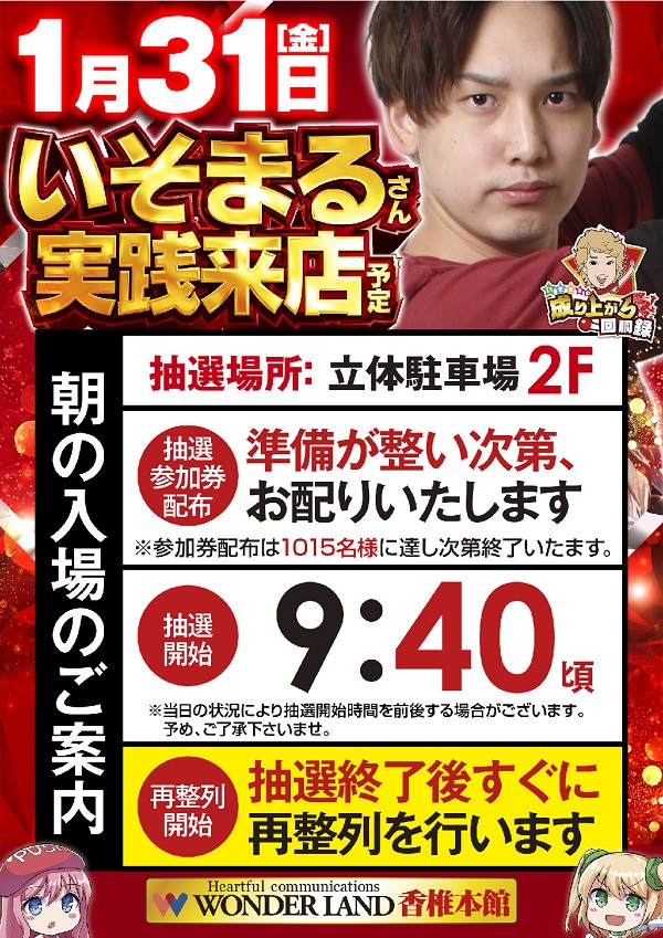 9:00~9:30スマホ抽選受付 9:45番号通知 9:55立駐2Fにて再整列 1円パチンコ優先入場は1Fにてご案内 |