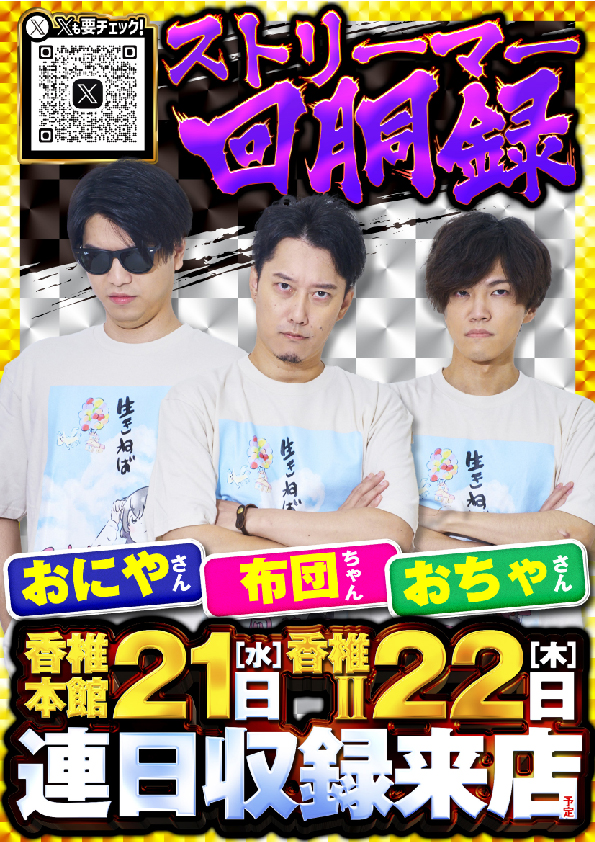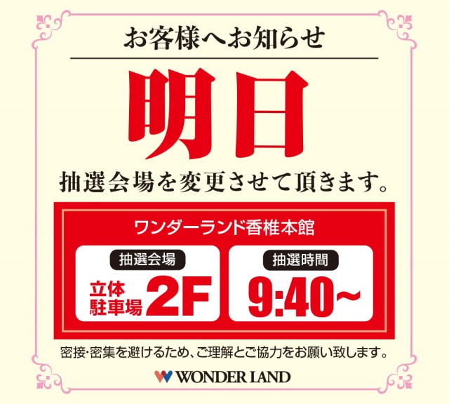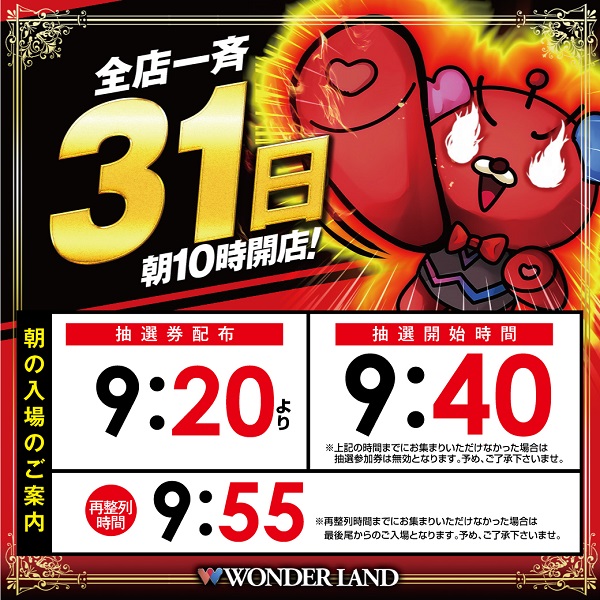 9:00~9:30スマホ抽選受付 9:45番号通知 9:55立駐2Fにて再整列 1円パチンコ優先入場は1Fにてご案内 |