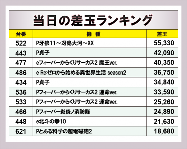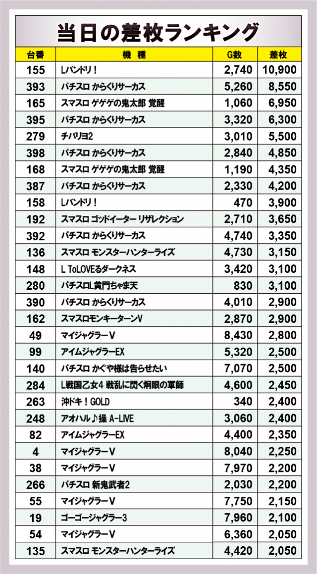 ※差枚数順に掲載しています。