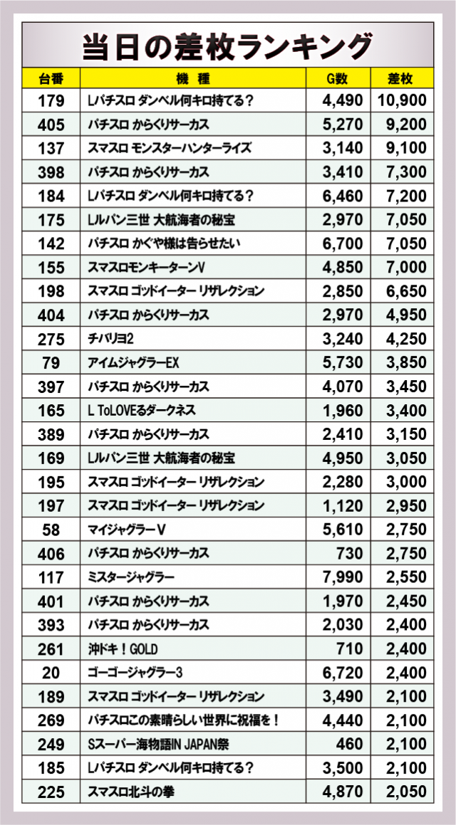 ※差枚数順に掲載しています。