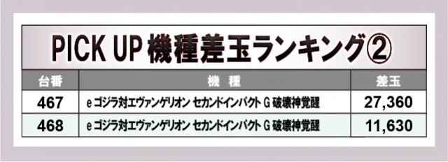 突出して目立っていたのが上表の3機種で、『P北斗の拳 暴凶星』の5万発OVER台を筆頭に、『P ゴジラ対エヴァンゲリオン セカンドインパクト G』『e ゴジラ対エヴァンゲリオン セカンドインパクト G 破壊神覚醒』の新台もしっかり盛り上がりを披露。各所で凄まじい活気と熱気に溢れており、相当な手応えを感じていた様子が窺える。