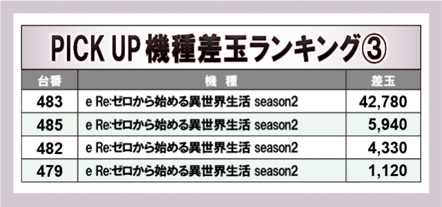 機種単位での活躍をみると、『新世紀エヴァンゲリオン〜未来への咆哮〜』『P北斗の拳 暴凶星』『e Re:ゼロから始める異世界生活 season2』『P Re:ゼロから始める異世界生活 鬼がかりver.』と定番人気機種でコンスタントな当選が繰り広げられ、ファンにとって打ちごたえのある状況だったに違いない。