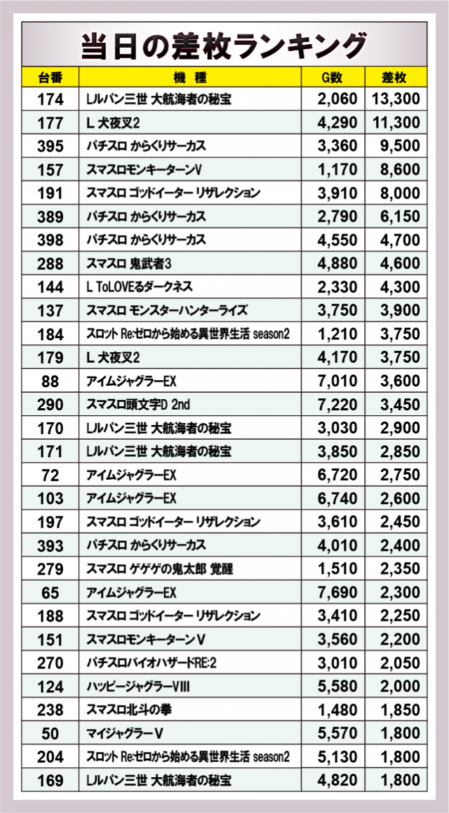 この日は、『Lルパン三世 大航海者の秘宝』『L 犬夜叉2』から万枚OVERが発生し、遊技していたファンはレバーオンに力が入ったことだろう。『パチスロ からくりサーカス』『スマスロモンキーターンV』『スマスロ ゴッドイーター リザレクション』も負けじと追随し、ファンは打ちごたえのある状況に歓喜していたはずだ。また、スマスロ機の活躍が目立っていたが、メダル機もしっかりランクインしており、幅広い機種にチャンスがあったことが窺える。