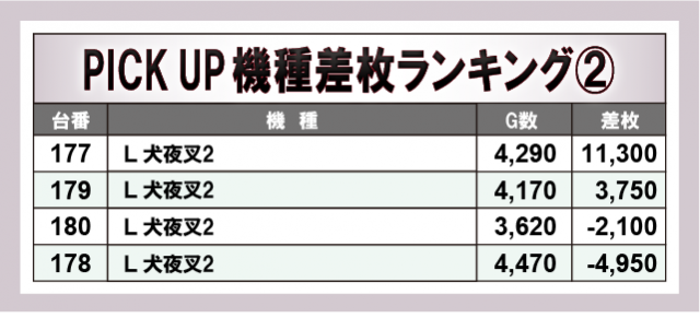 上表4機種がポテンシャルを存分に発揮し、コンスタントなボーナス当選が窺える内容となっている。万枚OVER台を筆頭に複数の4桁プラス台が発生し、ファンは有意義な時間を過ごせたことにより、同店の魅力に触れられたのは大きな収穫と言えるだろう。