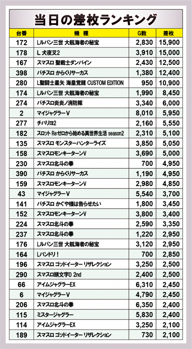 この日は、『Lルパン三世 大航海者の秘宝』『L 犬夜叉2』『スマスロ 聖戦士ダンバイン』『パチスロ からくりサーカス』『L聖闘士星矢 海皇覚醒 CUSTOM EDITION』から計5台の万枚OVERが発生!そのうち上位3機種が新台で今後の活躍も期待されるばかりだ。他にも、スマスロ定番機種をはじめ、『ジャグラー』シリーズも名を連ねており、各所で相当な手応えを感じていたファンが多かったと窺える。