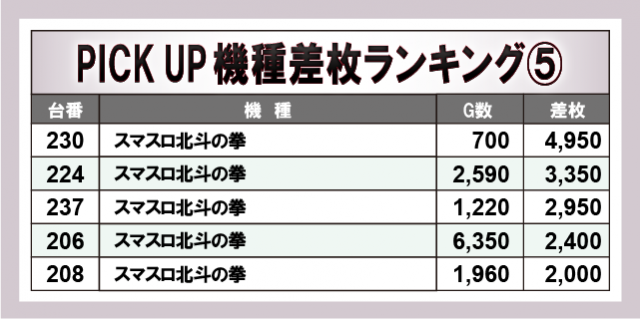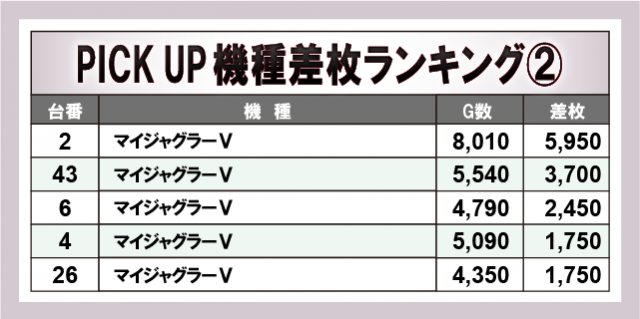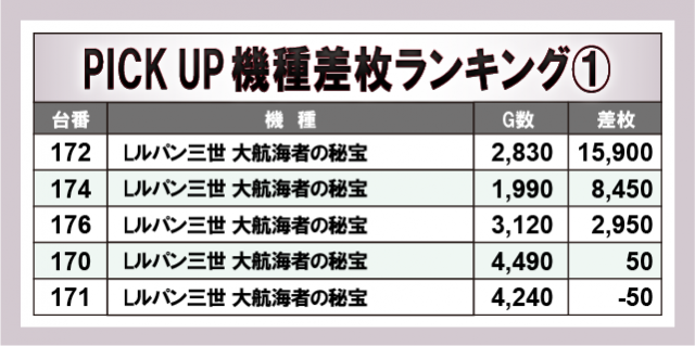 前述したように『Lルパン三世 大航海者の秘宝』『L 犬夜叉2』の万枚台が際立っているが、『スマスロモンキーターンV』『スマスロ北斗の拳』といった不動の人気機種もまた2,000枚OVERが多数発生し、ファンの意欲を掻き立てていた。それ以上に目に焼きつくのは『マイジャグラーⅤ』の活躍で、ノーマルタイプにして6,000枚近い出玉を記録し、じっくりと打ち込まれていた形跡が見て取れる。