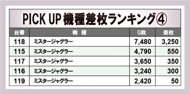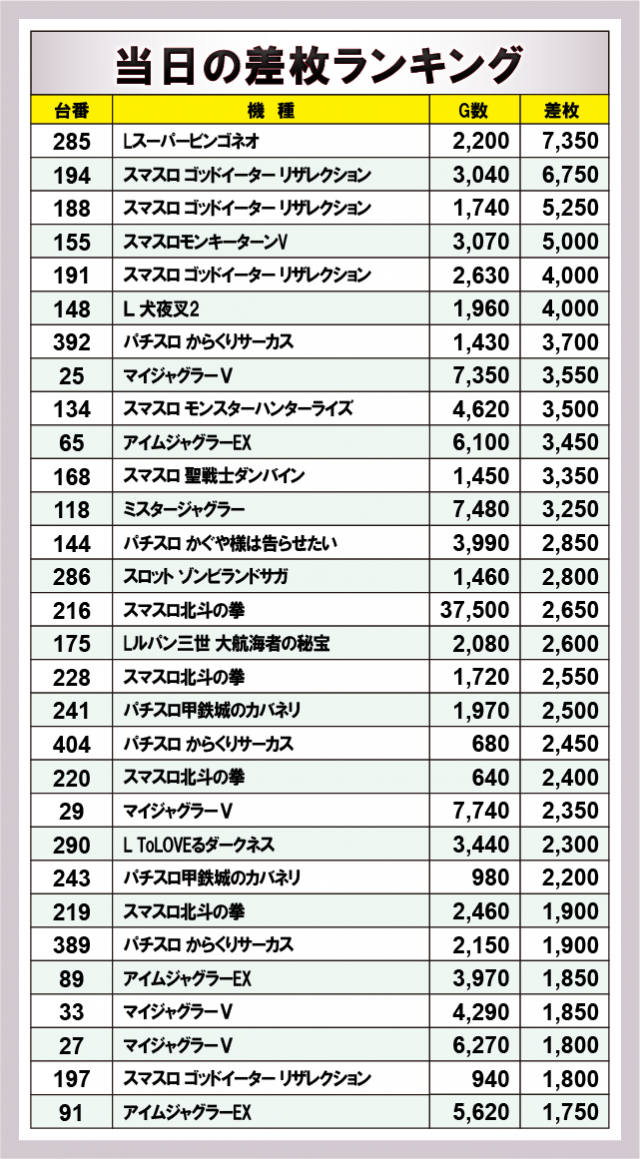 盛り上がりの中心となっていた優秀機種では、『ジャグラー』シリーズから4桁プラス台が複数うまれ、まとまった出玉を確保している点が好感を覚える部分だ。高い回転数も魅力的で、ファンは手応えを感じながらレバーを叩いていたことだろう。