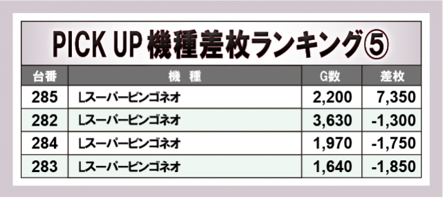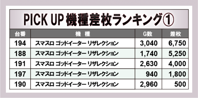 『Lスーパービンゴネオ』から7,000枚OVERが発生し、さらに『スマスロ ゴッドイーター リザレクション』『スマスロモンキーターンV』にて5~6,000枚OVERと、大台突破台の存在が確認できたことが何よりも好感を覚える部分である。その他にもスマスロ人気機種や『ジャグラー』シリーズの活躍も見逃せず、ファンは有意義な時間を過ごしていたはずだ。