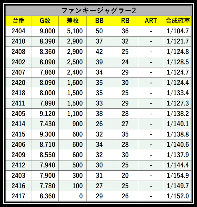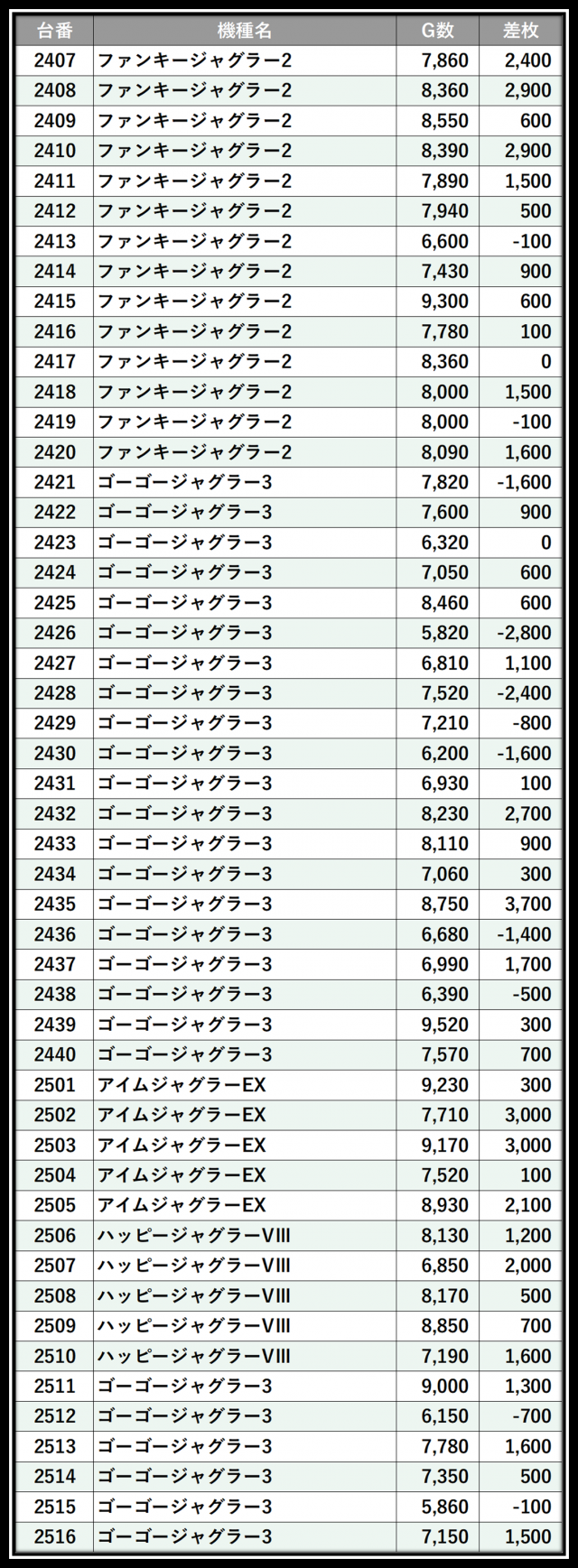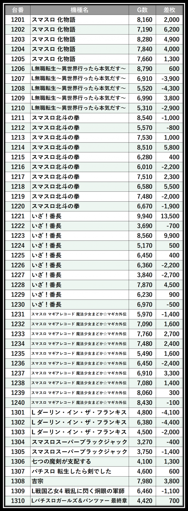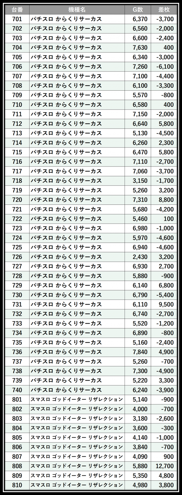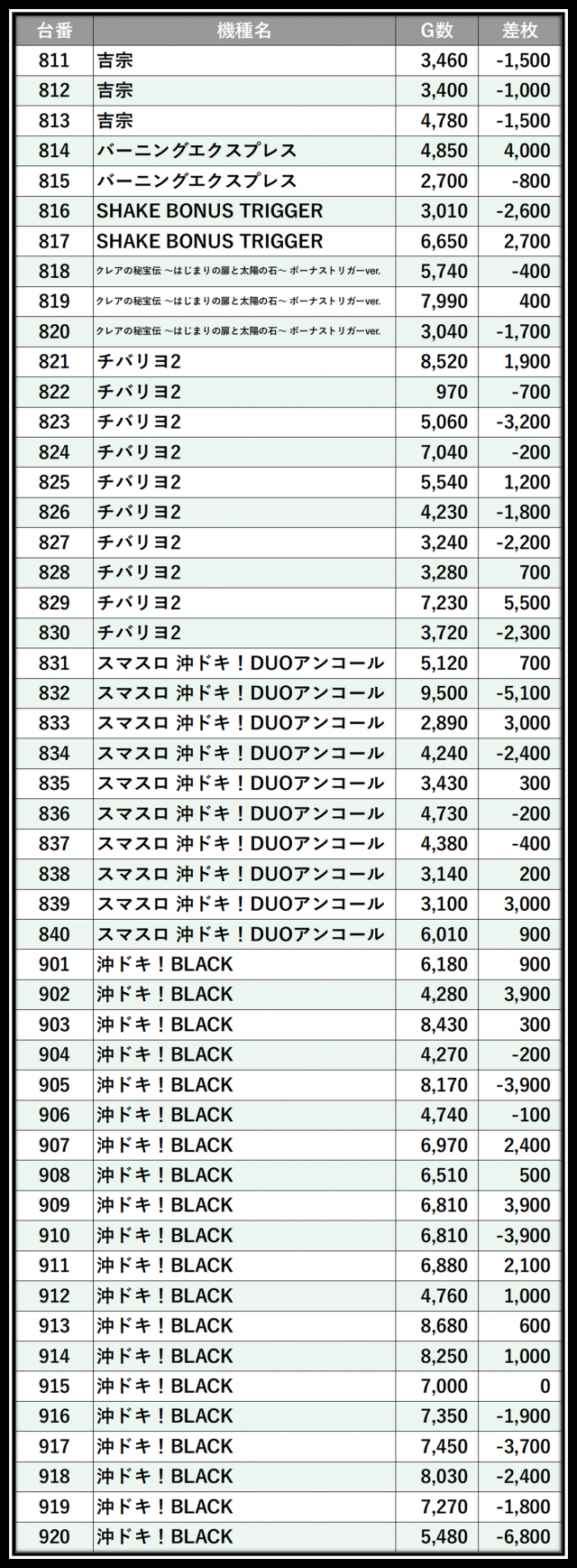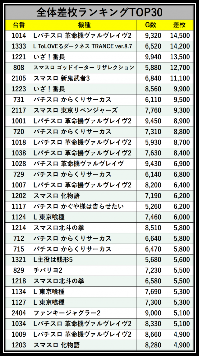 ※差枚数順に掲載しています
