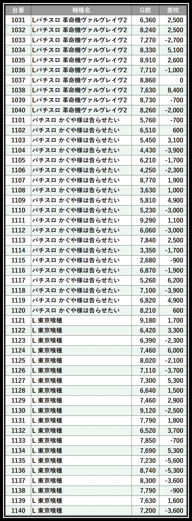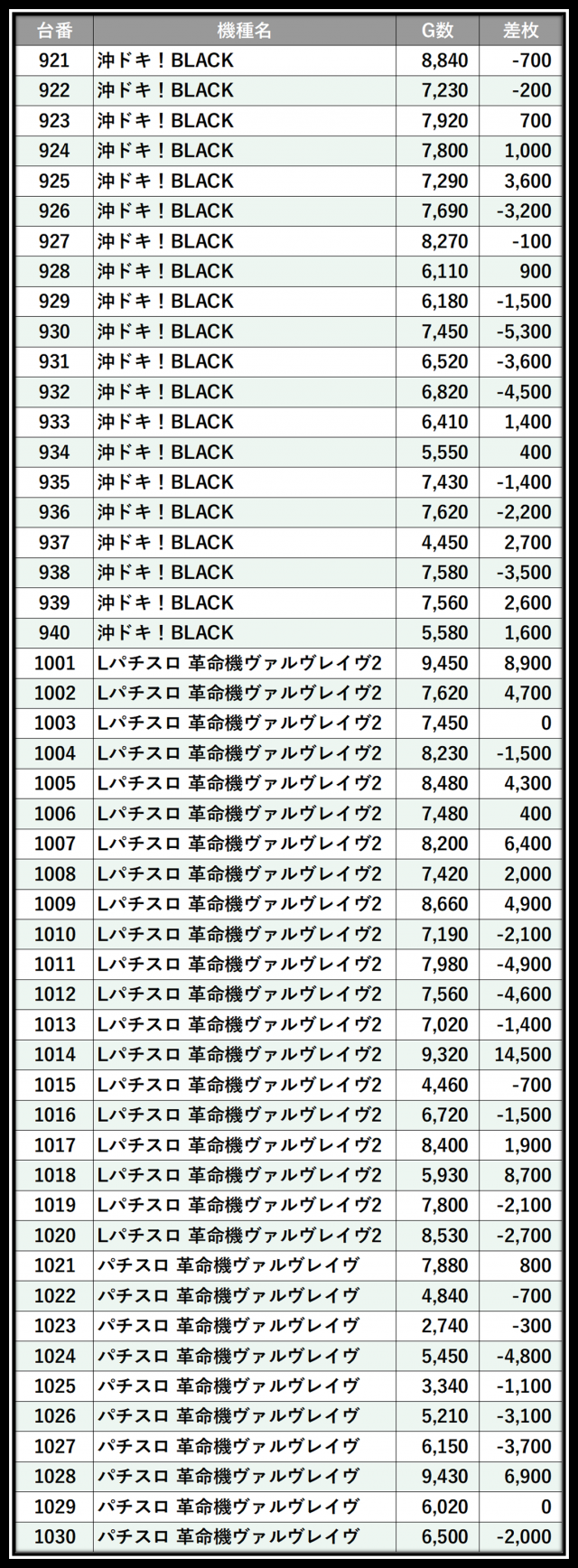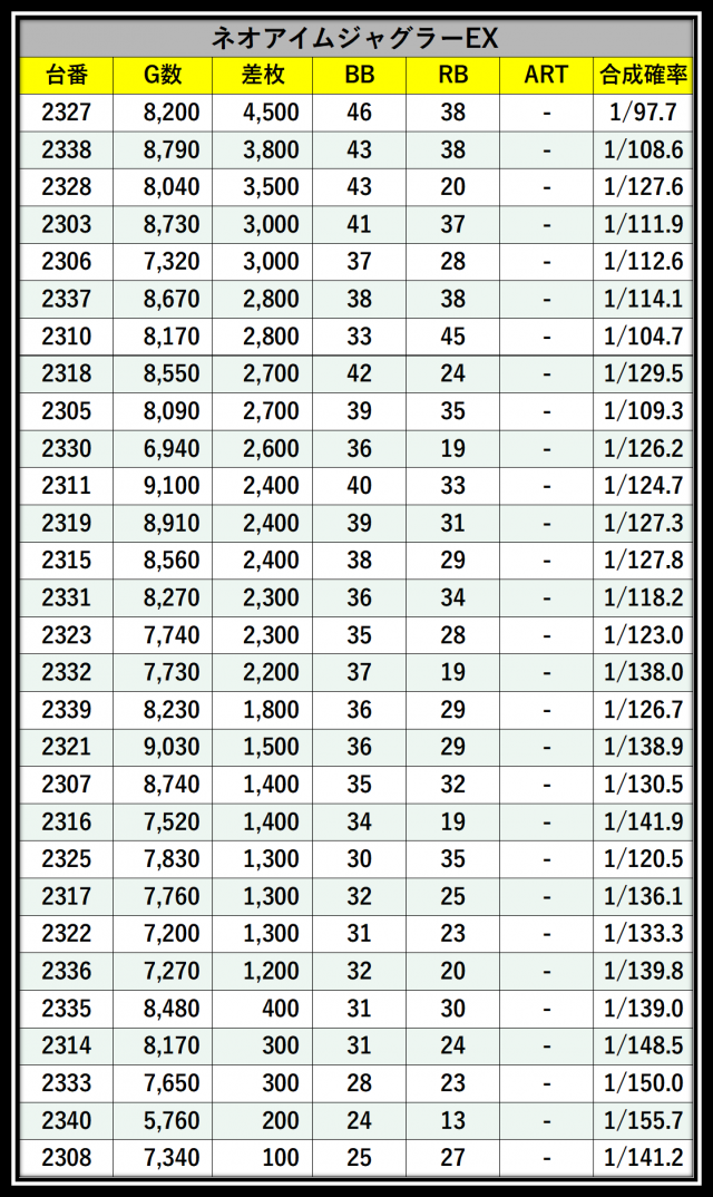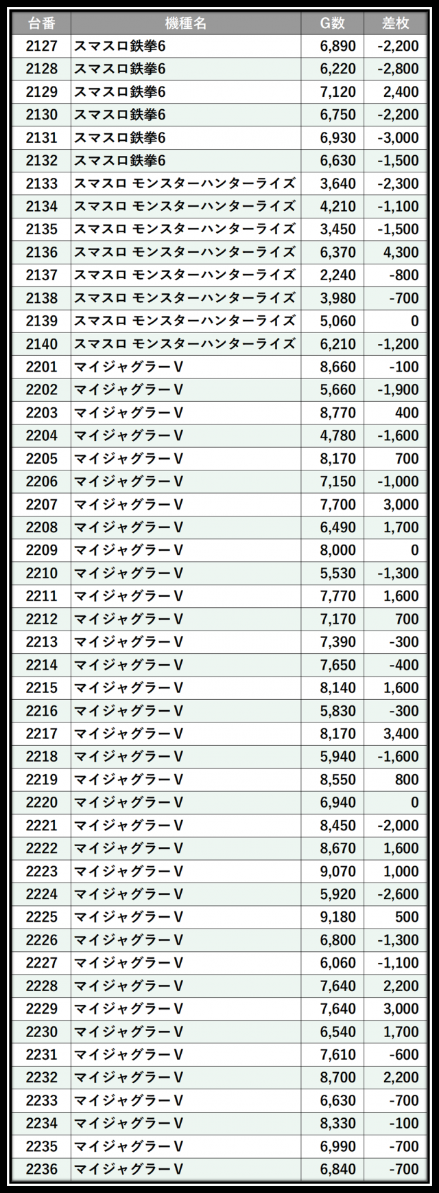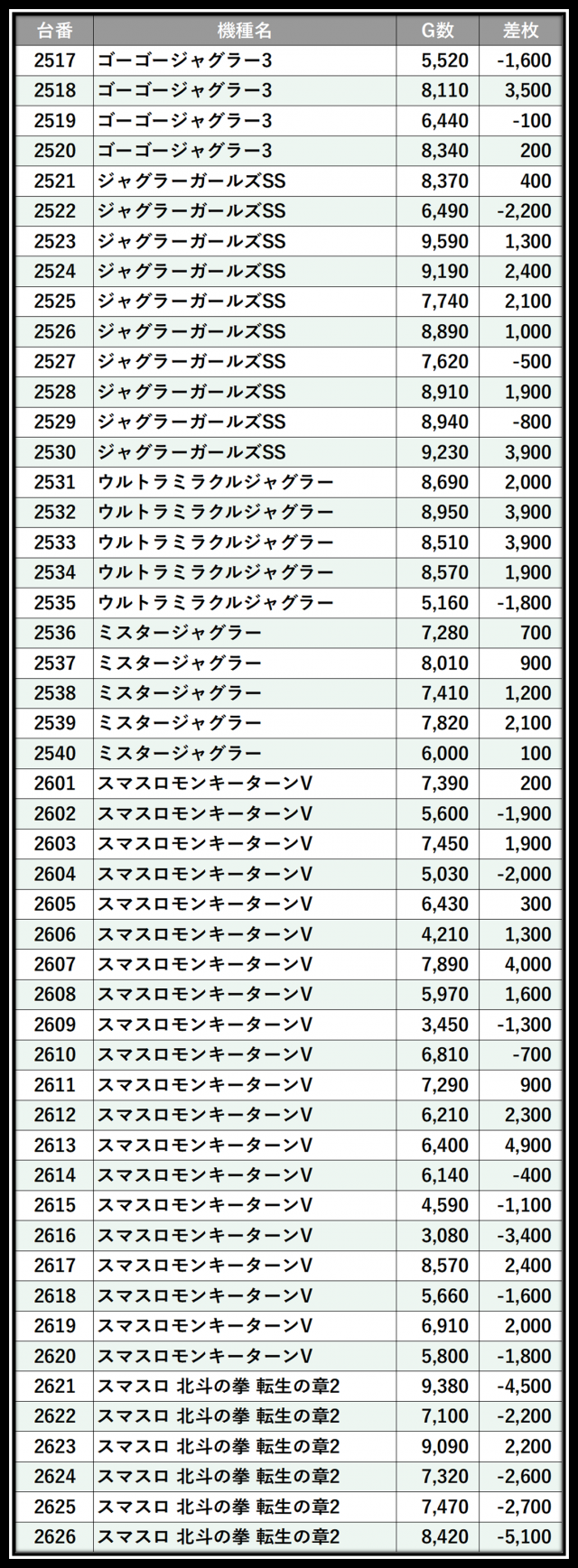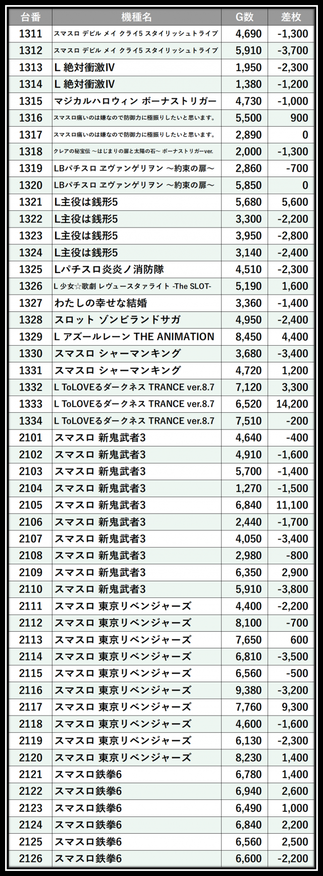※差枚数順に掲載しています