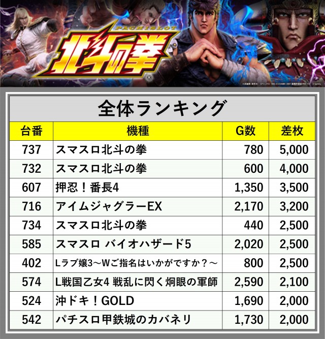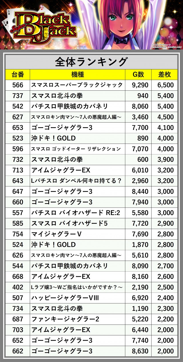 厳選された取材対象機種をはじめ、その他スロット全体から好記録が飛び出した!プレイヤーが楽しんだ1日を下記データにて振り返ってみて欲しい。