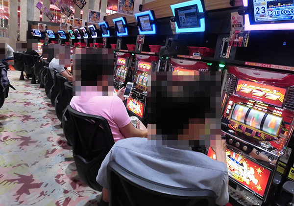 15時を過ぎた頃の20円パチスロで人気を集めていたのはジャグラーシリーズ。幅広い層のプレイヤーが遊技を楽しんでおり、見事なパフォーマンスを披露している姿もあった。