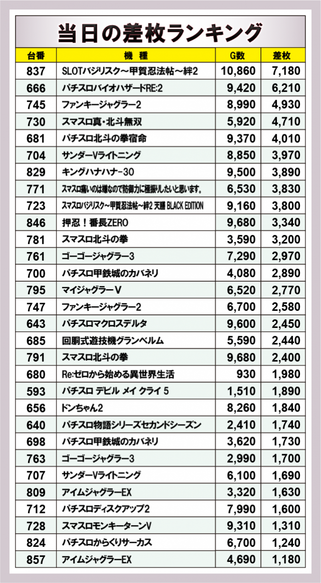 差枚ランキングをチェックしてみると、ピックアップ30台のうち18台が+2,000枚OVERを記録!それらの中でもっとも優秀だったのは、837番台の『SLOTバジリスク~甲賀忍法帖~絆2』で万回転を達成、差枚+7,180枚をマーク。また、『パチスロバイオハザードRE:2』『ファンキージャグラー2』などメダル機から大きな熱気が放たれていたのが目に焼きつく。