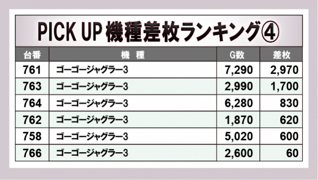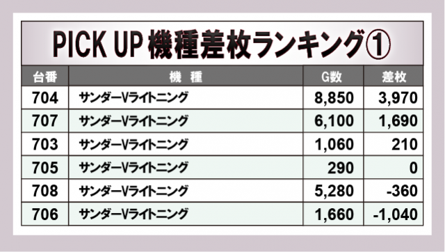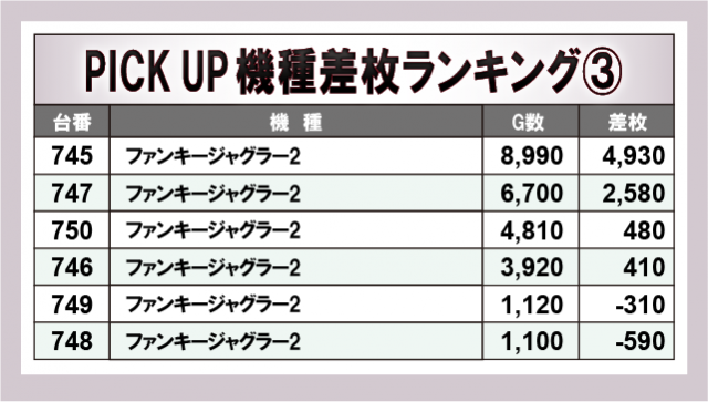 当日は注目すべき機種が多数見受けられた。ピックアップ全てがプラス差枚とはいかなかったものの、全体的に回転数と差枚数が比例する展開が顕著で、ファンは期待感を抑えきれずにレバーを叩いていたのではないだろうか。