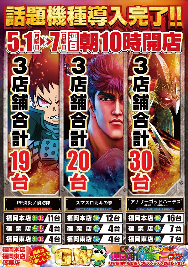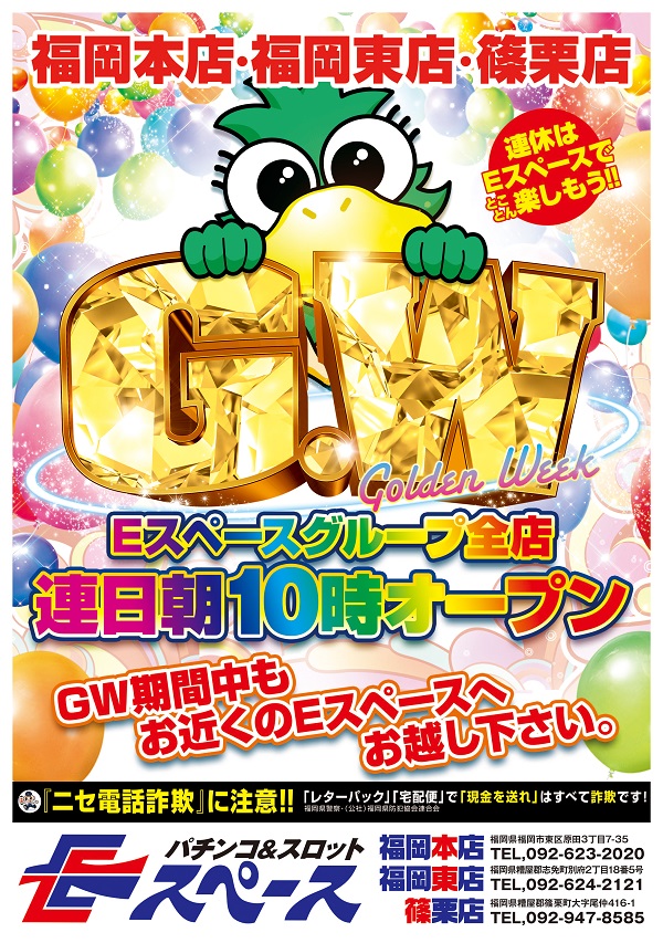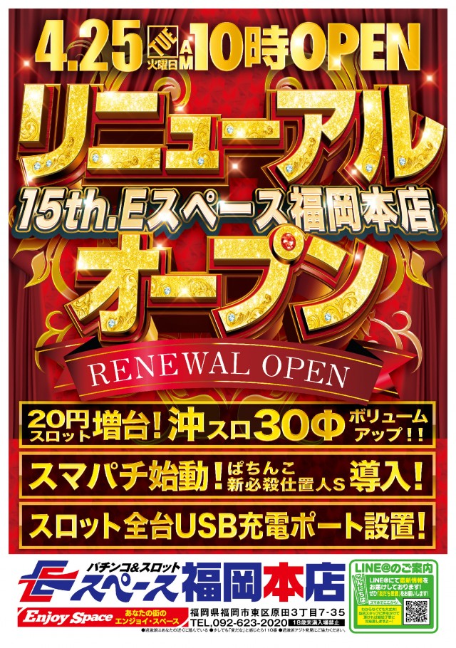 Eスペース福岡本店は、地域最大級の設置台数を誇る旗艦店舗です。最新機種からジャグラーシリーズまで幅広く取り揃え、パチンココースでは1円パチンコ地域最大の海コースを設置、スマスロ・スマパチ設置台数も地域1番です。加熱式タバコも吸えて快適な遊技環境と清潔な店内でお客様をお迎えしています。交通アクセスも良好で、仕事帰りや休日にも気軽に立ち寄れるお店です。地域の皆さまに「安心して楽しめる空間」を提供します