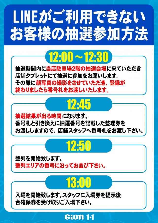 ■□■□■□■□■□■□■□■□■□■□■□■□■□■■■入場抽選■■【LINE抽選受付】AM9:00~9:45【店舗タブレット抽選受付】AM9:00~9:40【抽選結果発行】AM9:50