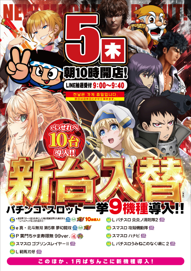 明日5日(木)🌟新台入替🌟朝10時オープン🌈