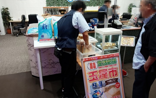 綺麗に陳列された賞品コーナーは魅力的なラインナップとなっており、店長オススメの「北斗の拳×芋焼酎」は特にコレクションしたくなる一品だ。さらにこの日はお米の量り売りで生活応援も実施されていたぞ!また、フロア内には前日までの出玉ランキングが出されている為、是非参考にしながら立ち回ってみよう!