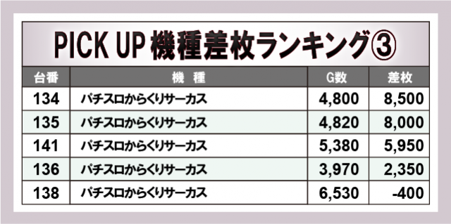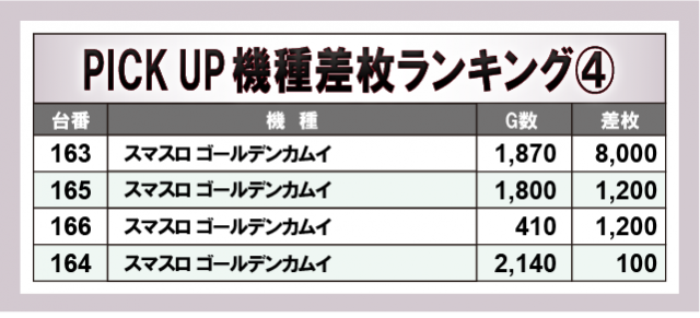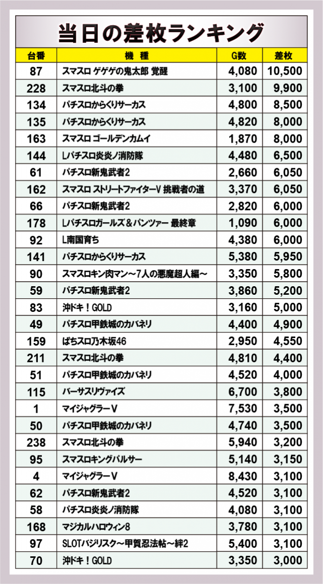 上表をご覧の通り、30台全てが+3,000枚OVERを記録!『スマスロ ゲゲゲの鬼太郎 覚醒』で万枚OVERを達成し、『スマスロ北斗の拳』から万枚未遂台、『パチスロからくりサーカス』『スマスロ ゴールデンカムイ』から+8,000枚OVERを記録。ほかにも多数の大台突破台が目立っており、ファンは有意義な時間を過ごすことができたはずだ。