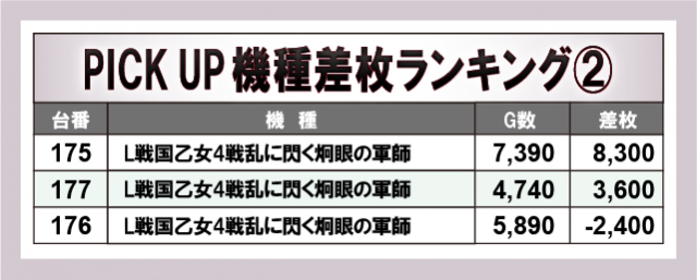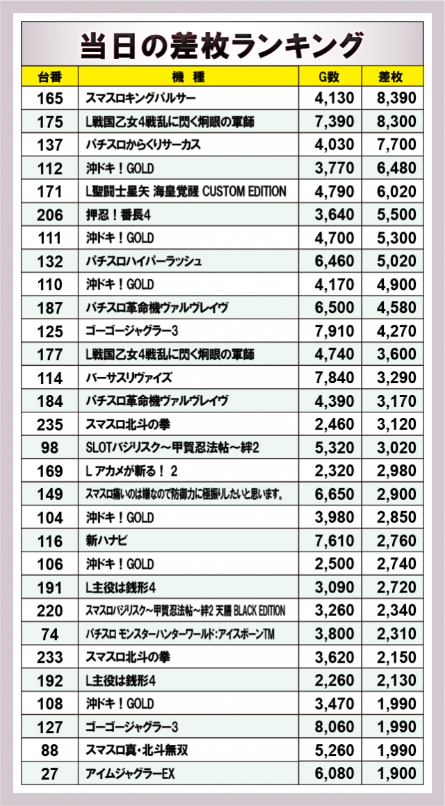 『スマスロキングパルサー』『L戦国乙女4戦乱に閃く炯眼の軍師』から+8千枚OVERが発生しており、それに続くように『パチスロからくりサーカス』で+7千枚OVER、『沖ドキ!GOLD』『L聖闘士星矢 海皇覚醒 CUSTOM EDITION』で+6千枚OVERをマークするなど、各所で大きな熱気が放たれていた。