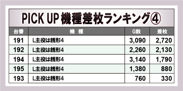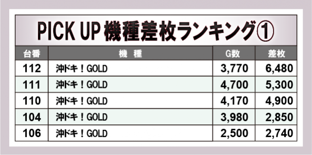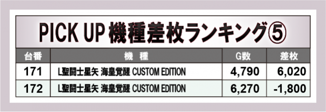 店内では注目すべき機種が多数見受けられた。特に上表の5機種は打ちごたえのある状況が整っていたことから、館内の盛り上がりに大きく貢献していたと言える。いずれも、差枚数プラス4桁を多数輩出しており、多くの台が可能性を秘めていたはずだ。