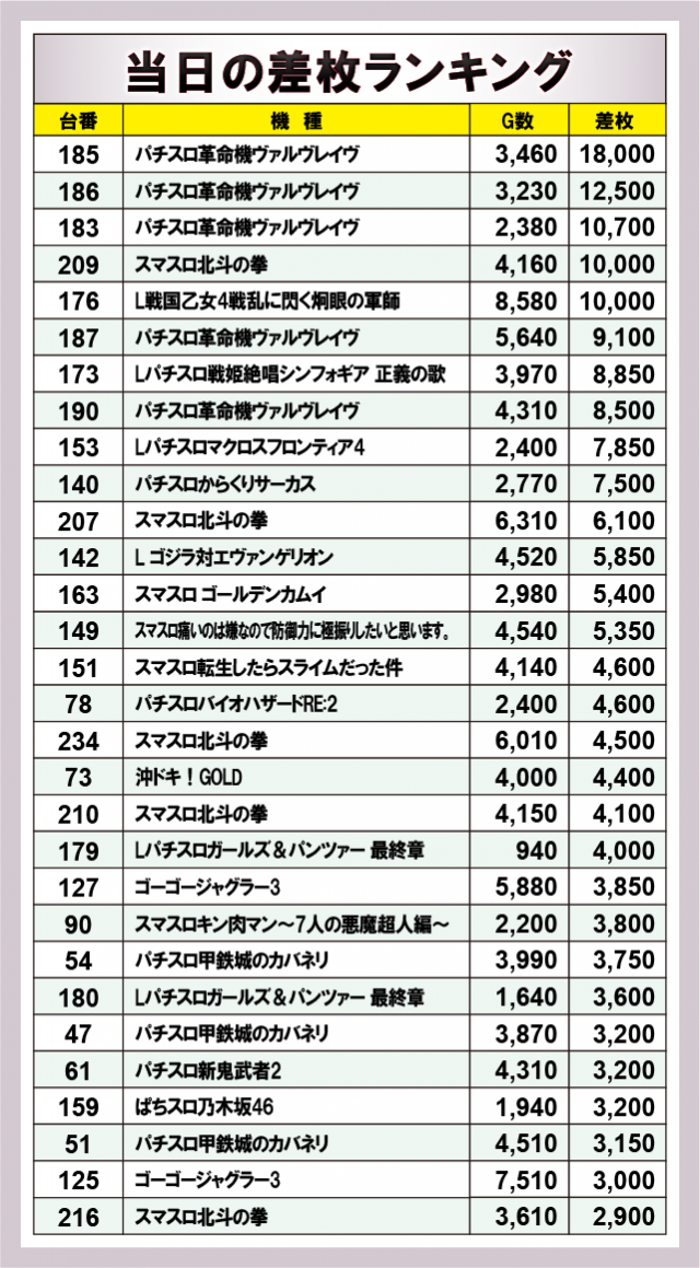 『パチスロ革命機ヴァルヴレイヴ』から3台の万枚OVERが発生!さらに『スマスロ北斗の拳』『L戦国乙女4戦乱に閃く炯眼の軍師』でも万枚OVERをマークし、スマスロの圧倒的存在感を示していた。この他にも右肩上がりのグラフを描く台が多数存在し、遊技していたファンは好感触に頬を緩めていたかもしれない。