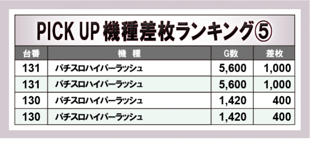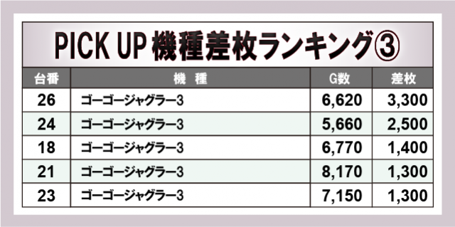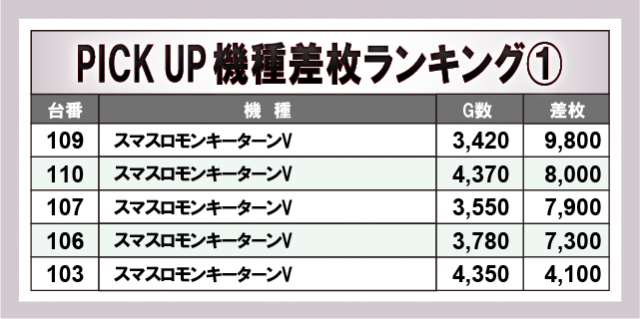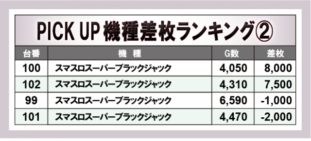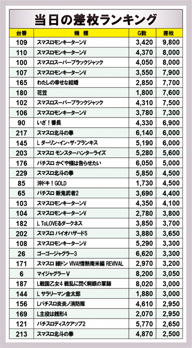 前述した『スマスロモンキーターンV』はもはや説明不要の高いポテンシャルを秘めていたが、その他にも『スマスロスーパーブラックジャック』『ゴーゴージャグラー3』『パチスロ 新鬼武者2』『パチスロハイパーラッシュ』とスマスロ機からメダル機まで多種多様に差枚数プラス4桁を輩出し、閉店までじっくりと打ち込まれた形跡が多々見られることから、ファンが確かな手ごたえを感じていたことが明らかであるだろう。