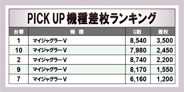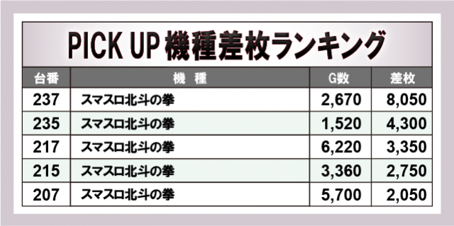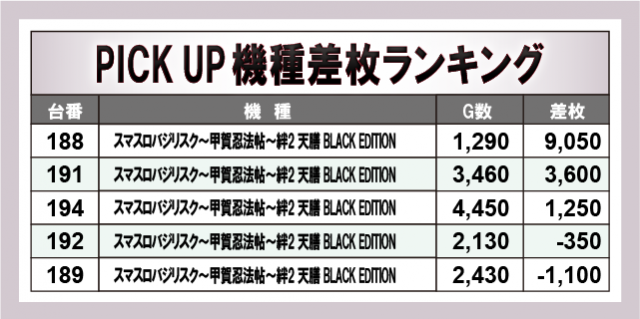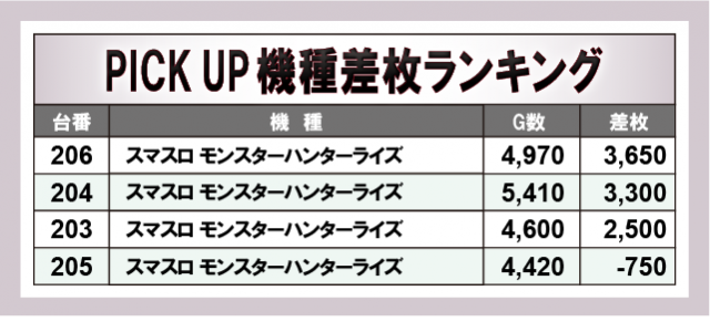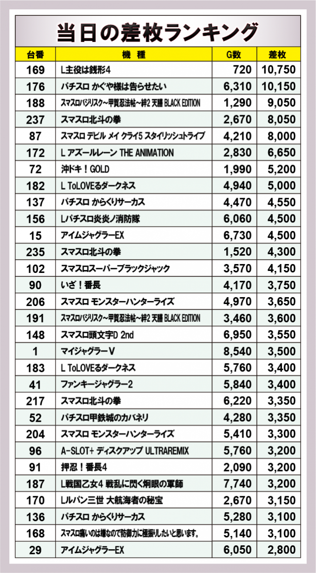 速報で報じた『アイムジャグラーEX』は、4,000枚OVER台を筆頭に4桁プラス台が複数うまれ、遊技するファンはレバーオンに力が入っていったはずだ。また『マイジャグラーⅤ』も同様に高い稼働をマークし、好成績を記録!さらに『スマスロ モンスターハンターライズ』『スマスロバジリスク~甲賀忍法帖~絆2 天膳 BLACK EDITION』『スマスロ北斗の拳』といったスマスロ機からもポテンシャルを秘めた台が多く存在し、至る所にチャンスが隠されていたようだ。