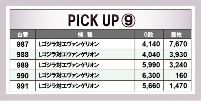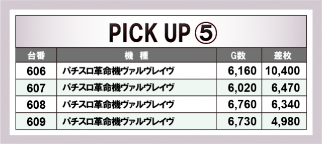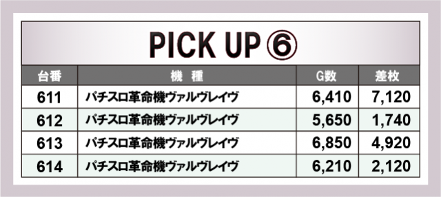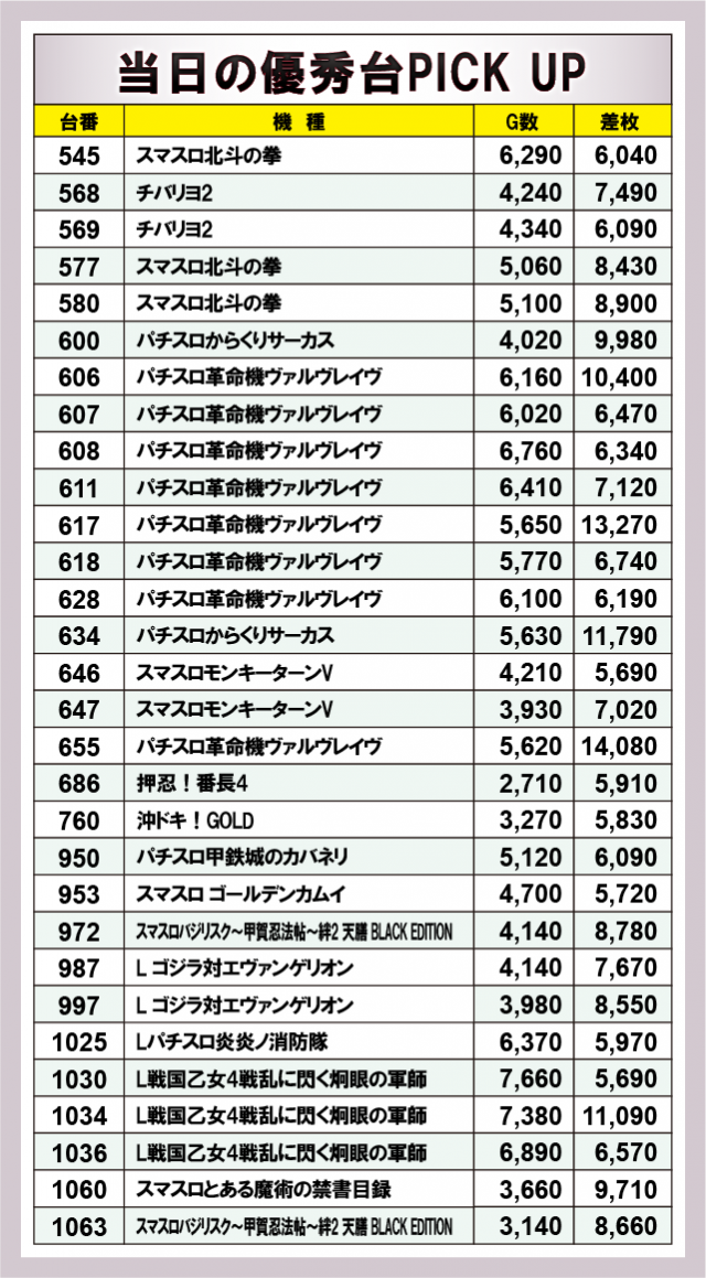 優秀台に目を通してみると、なんと30台全てが+5,000枚オーバーを記録!『パチスロ革命機ヴァルヴレイヴ』655番台+14,080枚・617番台+13,270枚・606番台+10,400枚と、同機種から3台の万枚超が存在し、大きな熱気が放たれていたのが目に焼きつく。ほかにも『パチスロからくりサーカス』634番台+11,790枚や『L戦国乙女4戦乱に閃く炯眼の軍師』1034番台+11,090枚といった盛り上がりが見られ、スマスロ人気機種を中心に有意義な時間を過ごせたファンが多かったはずだ。