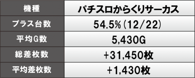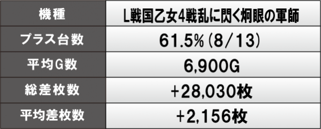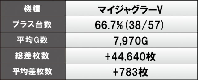 『マイジャグラーⅤ』『パチスロからくりサーカス』『L戦国乙女4戦乱に閃く炯眼の軍師』の3機種では、いずれもしっかりとプラス差枚を記録する台が多く、各総差枚数はプラス5桁をマーク!高い熱量で館内の盛り上がりに貢献していたことが窺える。