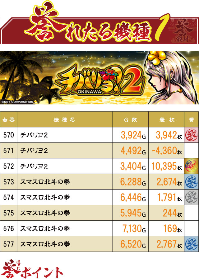 『チバリヨ2』の572番台から10,000枚オーバー台が誕生。またその周囲の台にもプラス台が多く、もしかすると優秀台がこのあたり一帯に固まっていたのかもしれない。