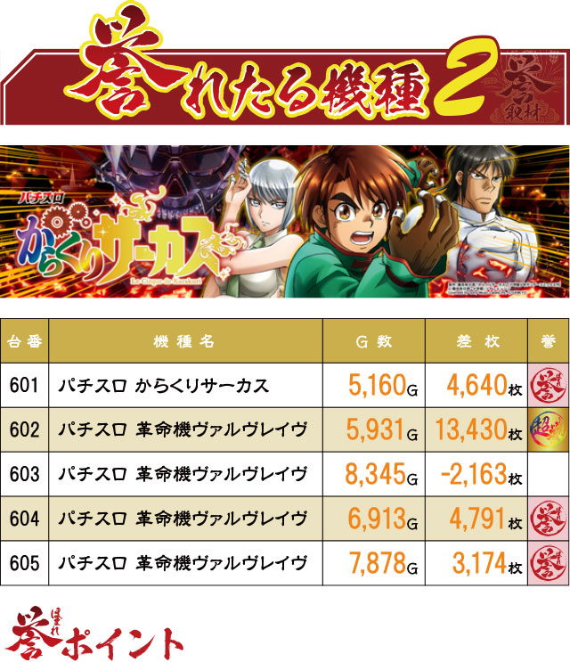 『パチスロ 革命機ヴァルヴレイヴ』の602番台からも10,000枚超えレコードが出現。さらに先ほどと同じく、こちらも周囲の台にはプラス台が多く、赤誉マーキングに囲まれる結果となった。