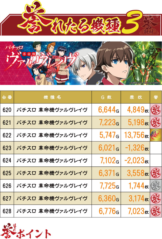 ぱちタウン取材班の予想通り、やはり『パチスロ 革命機ヴァルヴレイヴ』にはまだまだモンスターレコードが…!622番台の13,000枚超え記録をはじめ、赤誉マーキングがゴロゴロと生まれていた。次回も『ヴヴヴ』の動向に注目!