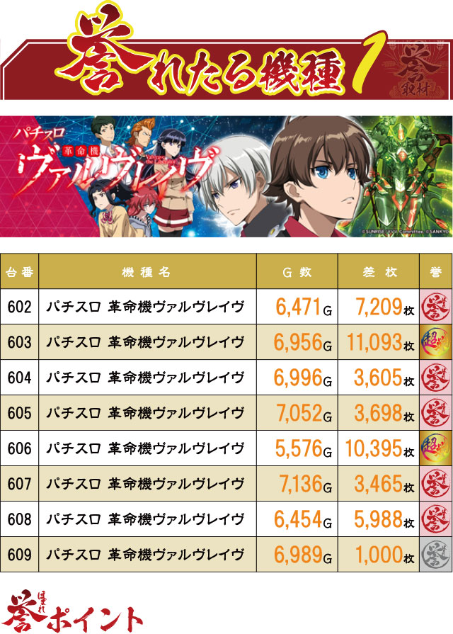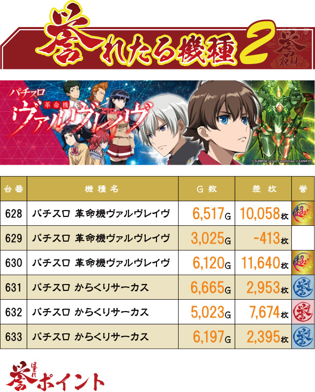 まだまだ『パチスロ 革命機ヴァルヴレイヴ』の勢いは止まらず。『パチスロ からくりサーカス』と隣り合っているこちらの6台の中にも10,000枚超えが2台!また『からくり』から+7,500枚超え記録が爆誕していた!