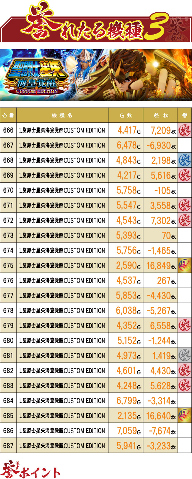 注目の新台『L聖闘士星矢海皇覚醒CUSTOM EDITION』は計22台が導入済み。その22台のトータル差枚はプラス、平均+2,004枚という素晴らしい環境だった。また、『星矢』からも10,000枚超えレコードが2台も!
