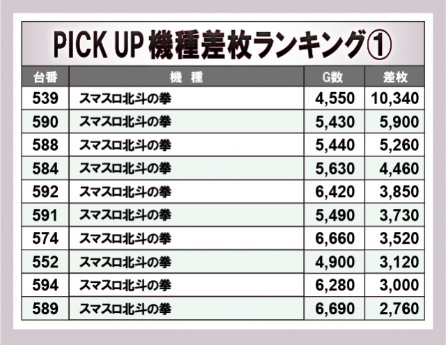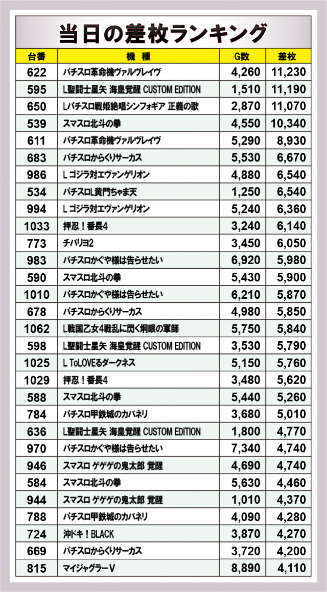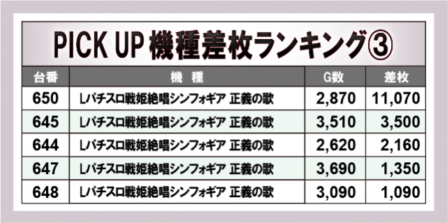 上表の5機種は多くの台が可能性を秘めており、打ちごたえのある状況が整っていたことから、館内の盛り上がりに大きく貢献していたと言える。各機種でまとまった出玉を獲得する台が多発し、明らかな好感触を得ては、気持ち良くレバーを叩けていた光景が想像に容易い内容だ。