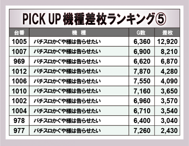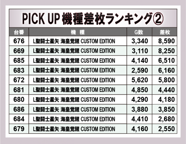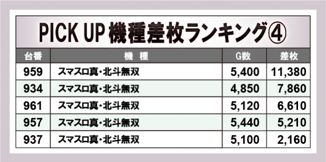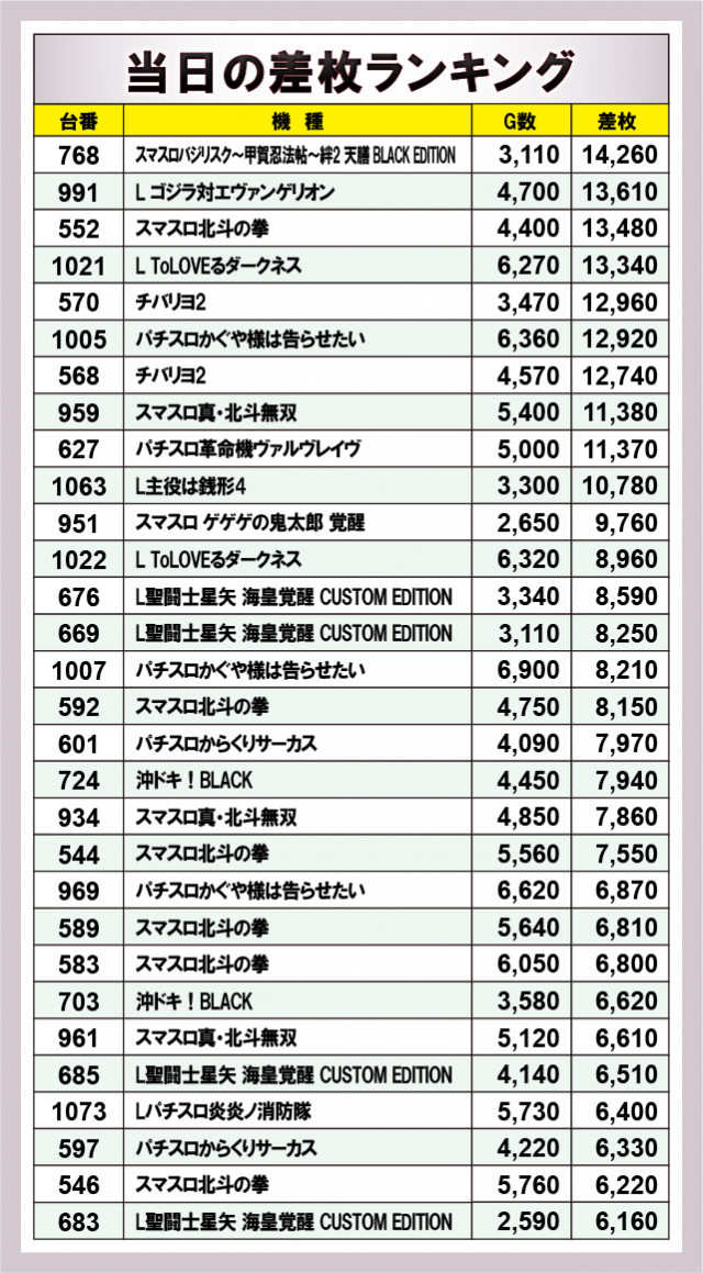 続いて優秀機種に目を向けると、複数のプラス差枚数を築いた台が目立っている。可能性を秘めていた台と言い換えることでき、いち早くそのことに気付いたファンは、レバーオンに力が入ったことだろう。なかでも『スマスロ北斗の拳』『L聖闘士星矢 海皇覚醒 CUSTOM EDITION』『パチスロかぐや様は告らせたい』からは大きな熱気が放たれ、ファンは有意義な時間を過ごしていたはずだ。