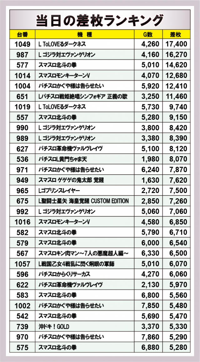 『L ToLOVEるダークネス』『L ゴジラ対エヴァンゲリオン』『スマスロ北斗の拳』『スマスロモンキーターンV』『パチスロかぐや様は告らせたい』『Lパチスロ戦姫絶唱シンフォギア 正義の歌』から計6台の万枚OVERが生まれ、さらには+8~9千枚OVER台も多数発生。店内は凄まじい熱気に包まれており、ファンは好状況に歓喜していたはずだ。