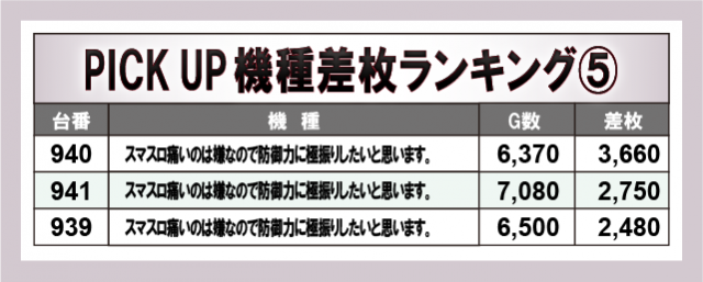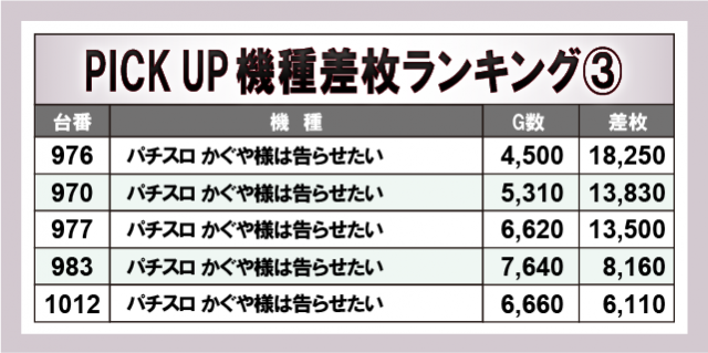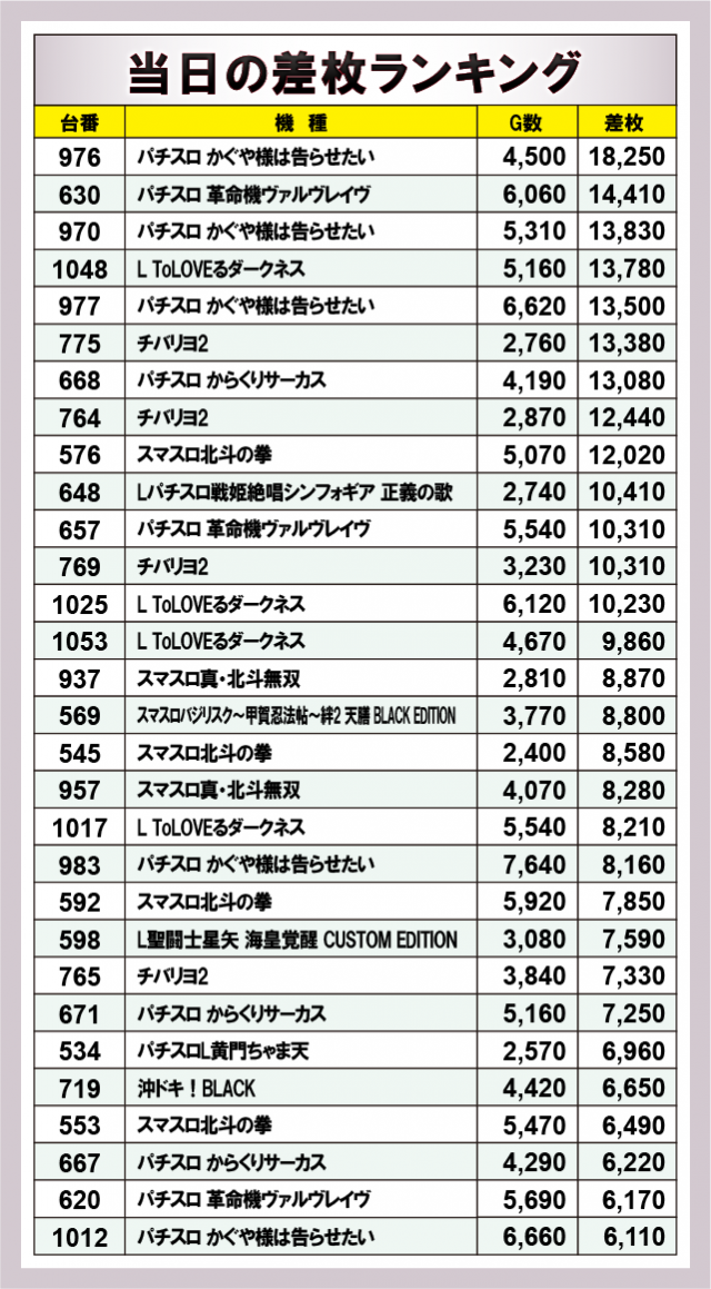 この日も圧巻のパフォーマンスを披露した事実は、上表からハッキリと読み取れるだろう。万枚OVERを達成した台は13台、それでいてピックアップした30台は6,000枚OVERからと凄まじい熱気が放たれており、遊技していたファンも歓喜したはずだ。