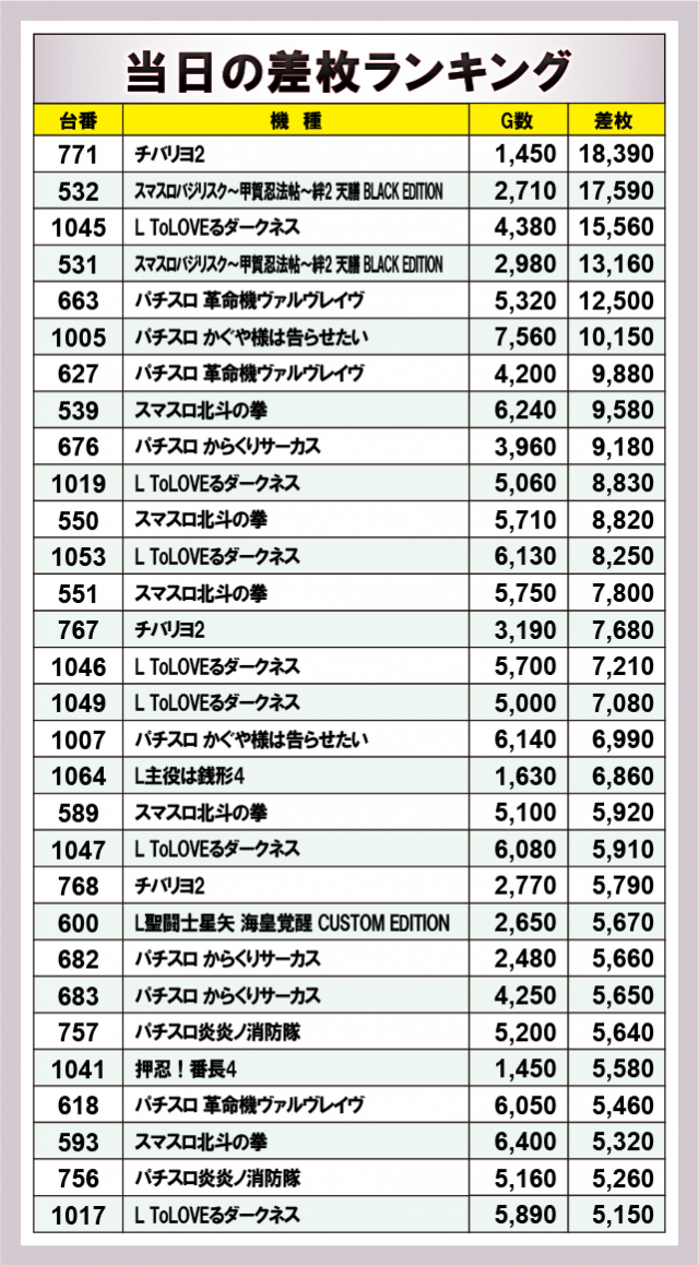 『チバリヨ2』『スマスロバジリスク~甲賀忍法帖~絆2 天膳 BLACK EDITION』『L ToLOVEるダークネス』『パチスロ 革命機ヴァルヴレイヴ』『パチスロ かぐや様は告らせたい』から計6台の万枚OVERが発生!また万枚に近づく台の存在も確認でき、遊技していたファンは大きな熱気に歓喜していたことだろう。さらにTOP30の台は5,000枚OVERから名を連ねている点も、同店の高い実力を証明していると言える。