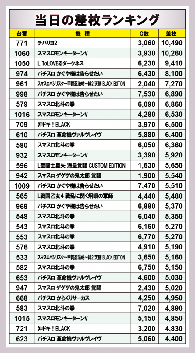 当日の差枚ランキングを見てみると、『チバリヨ2』『スマスロモンキーターンV』から万枚OVERを記録し、ホール内を存分に盛り上げていた。 また『L ToLOVEるダークネス』が万枚に届く勢いをみせていた。そのほかにも+5,000枚OVERの大台突破台多数誕生し、十分な手応えを感じたファンも多かったに違いない。