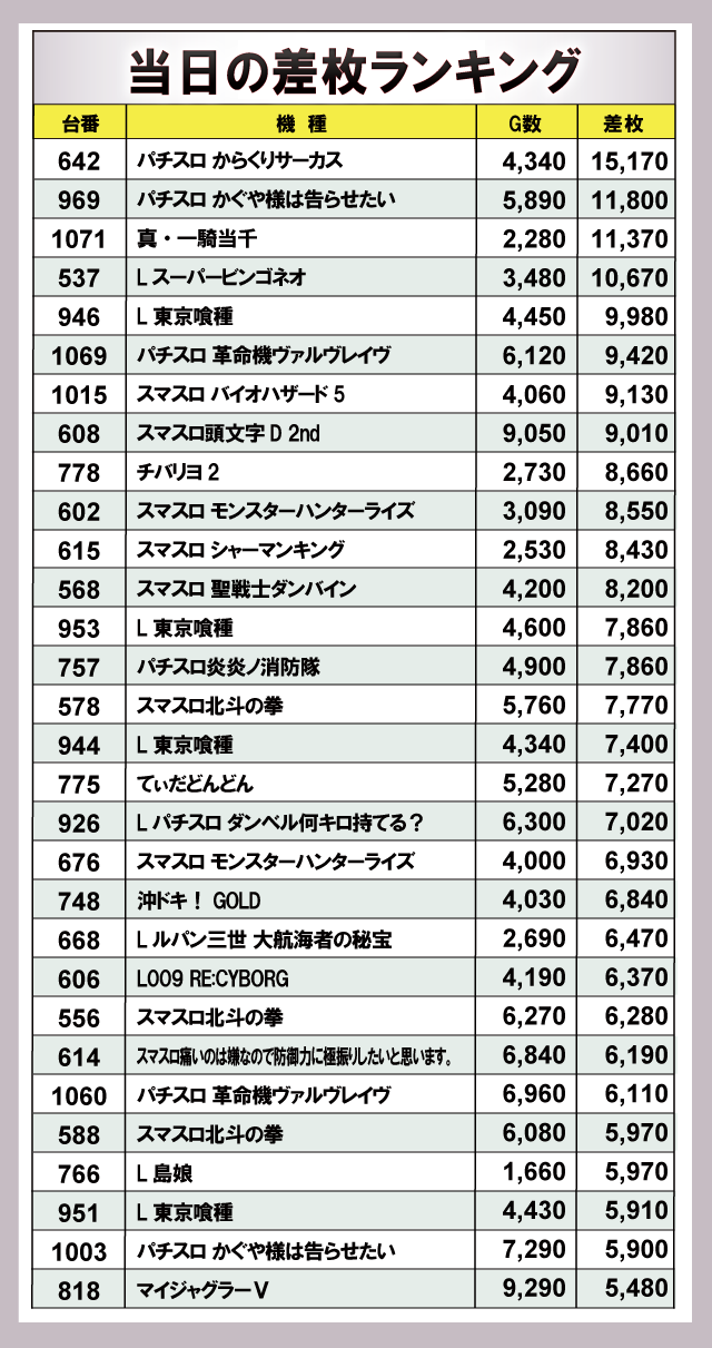 『パチスロ からくりサーカス』『パチスロ かぐや様は告らせたい』『真・一騎当千』『Lスーパービンゴネオ』の4台から万枚OVERが発生し、店内の盛り上がりを牽引する存在となっていた。これらに続き『L 東京喰種』『パチスロ 革命機ヴァルヴレイヴ』『スマスロ バイオハザード5』『スマスロ頭文字D 2nd』から+9,000枚OVERをマークし、各所で熱気が渦巻き店内のボルテージは最高潮に達していたようだ!