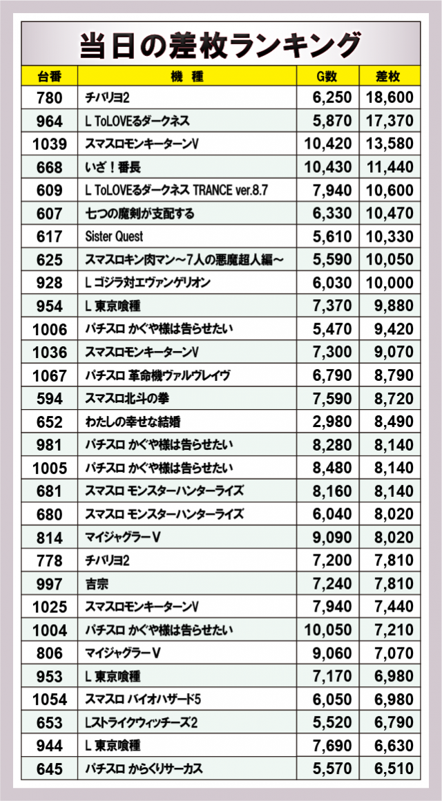 上表から分かるように、トップ30台は6,000枚OVERからとなっており、その中で9台の万枚OVERが発生!トップに輝いた『チバリヨ2』はコンプリート目前の+18,600枚をマーク!ランキング全体を見渡すと、スマスロ機の活躍が目立つ一方で『マイジャグラーⅤ』から+8,020枚・+7,070枚とAT機に負けない好記録が飛び出していた!また万回転OVERも複数台みられ、活気と熱気が店内に充満していたのも見逃せない。