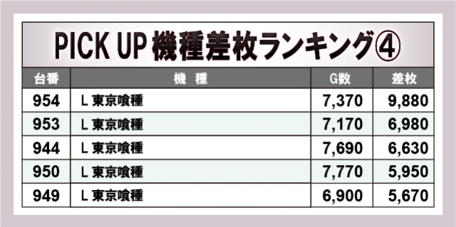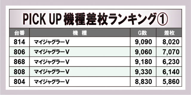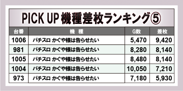 活躍の中心となったのは上表の5機種。なかでも『マイジャグラーⅤ』は上表以外にも大きな熱気を放っている台が多数あり、遊技していたファンが明らかな好感触を掴んでいたのは間違いない。AT機では『スマスロモンキーターンV』『スマスロ北斗の拳』『L 東京喰種』『パチスロ かぐや様は告らせたい』といったスマスロ定番人気機種からの大台突破台の多さにファンも歓喜したはずだ。また、閉店までじっくりと打ち込まれた機種ばかりで、充実のひと時を過ごせたに違いない。