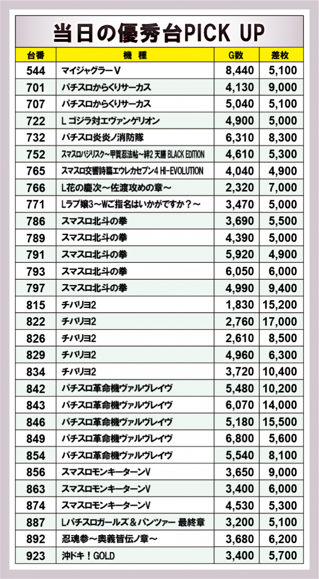 優秀台に目を通してみると、差枚数で大きな数字を打ち立てたのが『チバリヨ2』と『パチスロ革命機ヴァルヴレイヴ』で、どちらも3台の万枚OVERを記録!そのほか、スマスロ人気機種が中心となって盛り上がりを形成しており、各所でファンが笑顔を浮かべる光景が広がっていた。