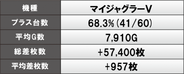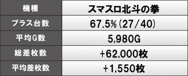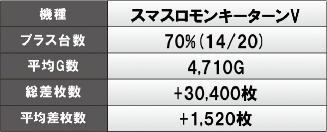 『スマスロ北斗の拳』『スマスロモンキーターンV』『マイジャグラーⅤ』の3機種は特に叩きがいのある状況が整っており、いずれも勝率6割以上、総差枚数5桁プラスを記録。同機種を遊技するファンに手ごたえを感じさせたはずだ。